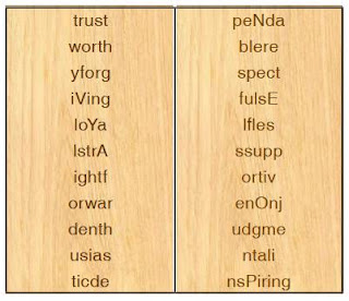 Berikut ini adalah daftar 10 kualitas teratas dari seorang teman baik. Namun, kata-kata tersebut ditulis secara berhubungan satu sama lain. Kapitalisasi juga salah. Temukan sepuluh kata dengan membaca kedua kelompok kata yang tampaknya tidak masuk akal ini dari kiri atas ke bawah dan kemudian ke kanan dan ke bawah lagi. Sebagai contoh, kualitas pertama adalah trustworthy (dapat dipercaya). Apa sembilan kualitas lainnya? Bekerja berpasangan dan bersaing untuk menjadi yang tercepat dalam menemukan mereka.