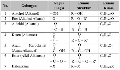 Banyaknya gugus fungsi dari senyawa karbon turunan alkana jumlahnya ada 7. Berikut daftar dari gugus fungsi senyawa karbon: