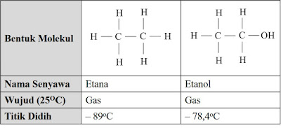 Pada gambar di atas bisa kita analisa bahwa titik didih kedua senyawa tersebut berbeda, padahal perbedaan dari kedua senyawa tersebut amat “kecil”, yaitu satu atom H pada senyawa pertama diganti dengan gugus fungsi -OH pada senyawa kedua. Dapat disimpulkan bahwa gugus fungsi menentukan sifat suatu senyawa.