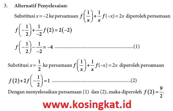 3. Misalkan f fungsi yang memenuhi f(1/x) + 1/x f(–x) = 2x untuk setiap x ≠ 0. Tentukanlah nilai f(2).