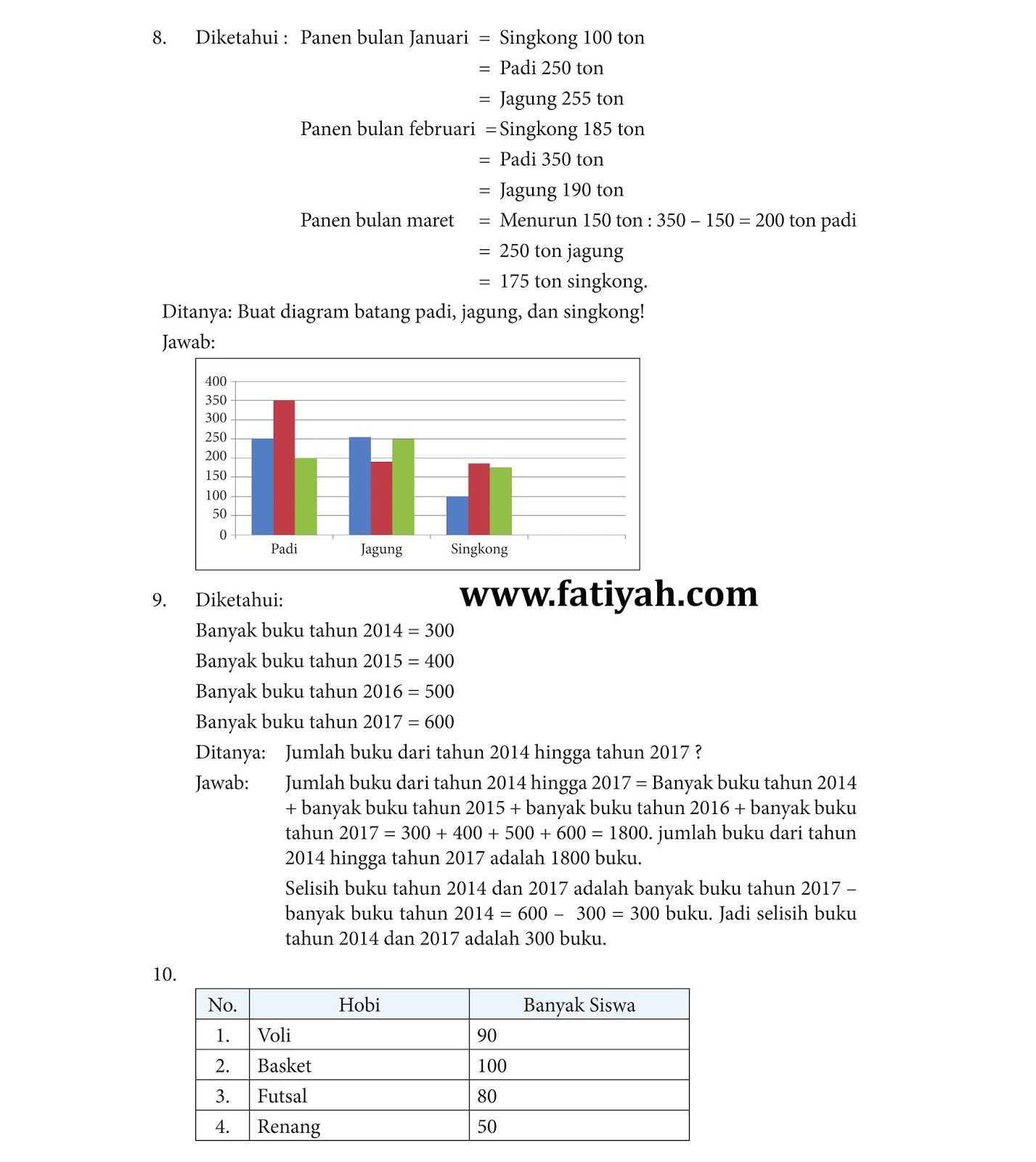 8. Di sebuah desa, pada bulan Januari hasil panen padi mencapai 250 ton, panen jagung mencapai 255 ton, dan panen singkong 100 ton. Pada bulan Februari hasil panen padi mencapai 350 ton, hasil panen jagung 190 ton, dan hasil panen singkong mencapai 185 ton. Sementara itu pada bulan Maret panen padi menurun 150 ton, hasil panen jagung 250 ton, dan hasil panen singkong mencapai 175 ton. Buatlah diagram batang dari hasil panen padi, jagung, dan singkong tersebut.
