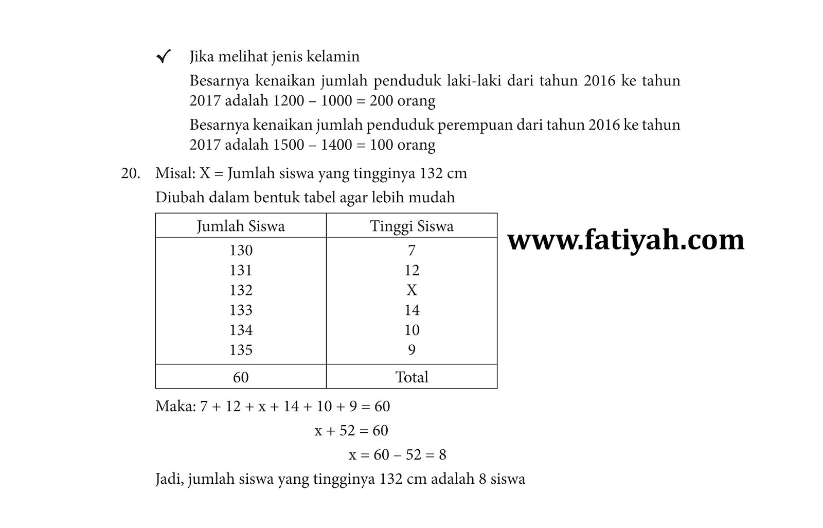 20. Data tinggi badan siswa kelas IV disajikan dalam diagram berikut. Jika banyak siswa kelas IV seluruhnya adalah 60, maka berapa banyak siswa kelas IV yang mempunyai tinggi badan 132 cm?